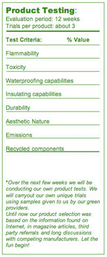 We have done a lot of research about Green Materials to ensure we are using sustainable green products. There is such a vast amount of new green products that it would be impossible for us to know them all. We are constantly learning about new products. If you know a product, or make a product that is truly green, eco-conscious, and it fits our specific green criteria, send us an email. The only way for Green products to grow and become more financially attainable in the mainstream is to get them out there. We would love to hear from you.